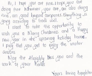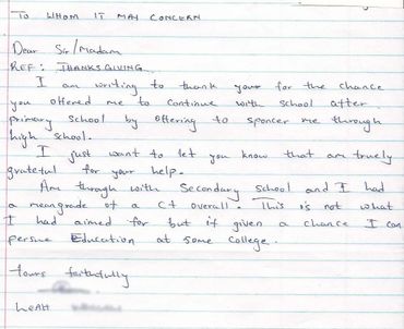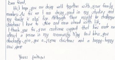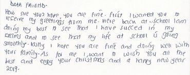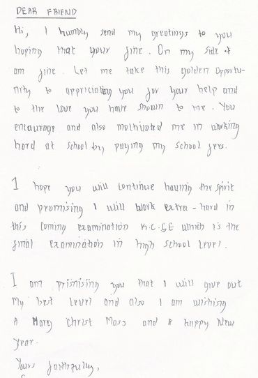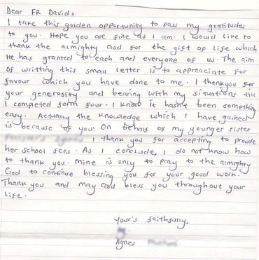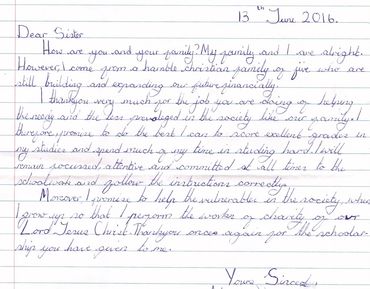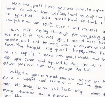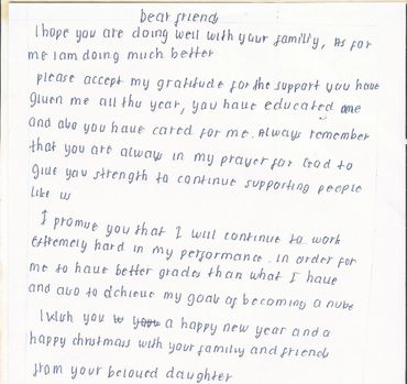 you have given me to finish my studies this year. The least I can do to repay you is to dedicate myself to my study. Thank you for making my dream come true. May the Lord reward you for the good you have done for us, may the Lord watch over your health. The feeling of gratitude is a hard thing to describe. Finishing with many thanks."