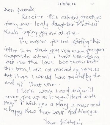 I hope this letter finds all of you well you well. I wanted to take a moment to express my heartfelt gratitude to you all for all that you have done for me and other girls in Africa, especially in sending me to school and paying all my fees. I am truly blessed to a beneficiary of your charity and the cares. Your unwavering support since I joined form one and dedication to my education have been instrumental in shaping the person I am today. I am sure could not have made it this far without your help my dreams of becoming a doctor would have remained with me at Mathare slum but now with you paying my school fee and other requirement I believe with Gods Help I will realize them. As I reflect on my journey so far, I am filled with immense gratitude for all the sacrifices you have made to ensure that I receive the best education possible. Your hard work and sacrifices have not gone unnoticed, and I want you to know that I am truly grateful for everything you have done for me.